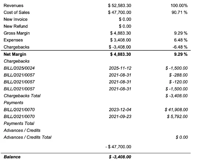 Programs can be shared through the supplier portal and each program can display a liquidation PDF. The desired experience also includes a summary view showing core metrics outside the PDF: Revenue, Cost of Sales, Margin, Expenses, Chargebacks, Payments list, Balance.